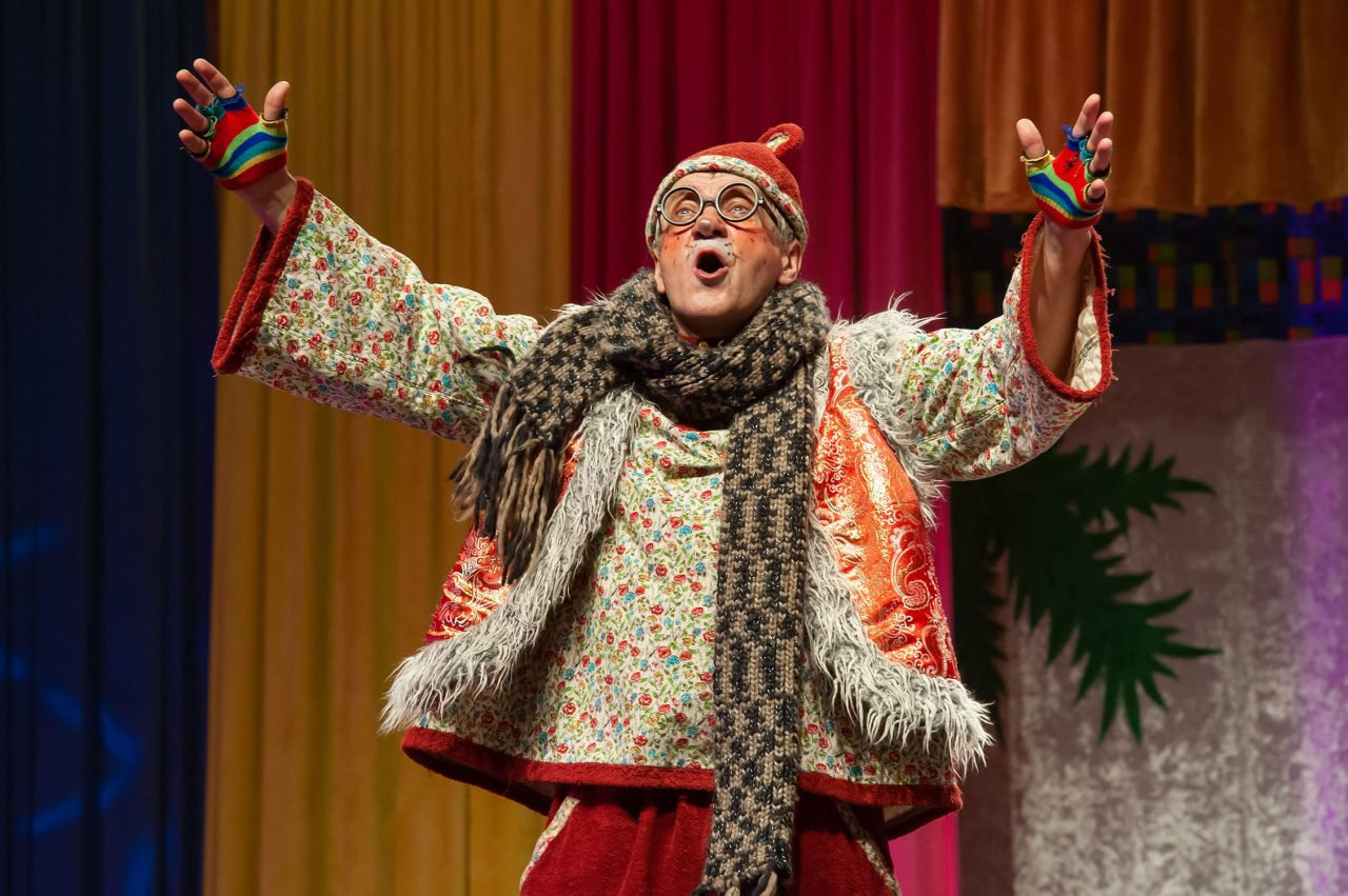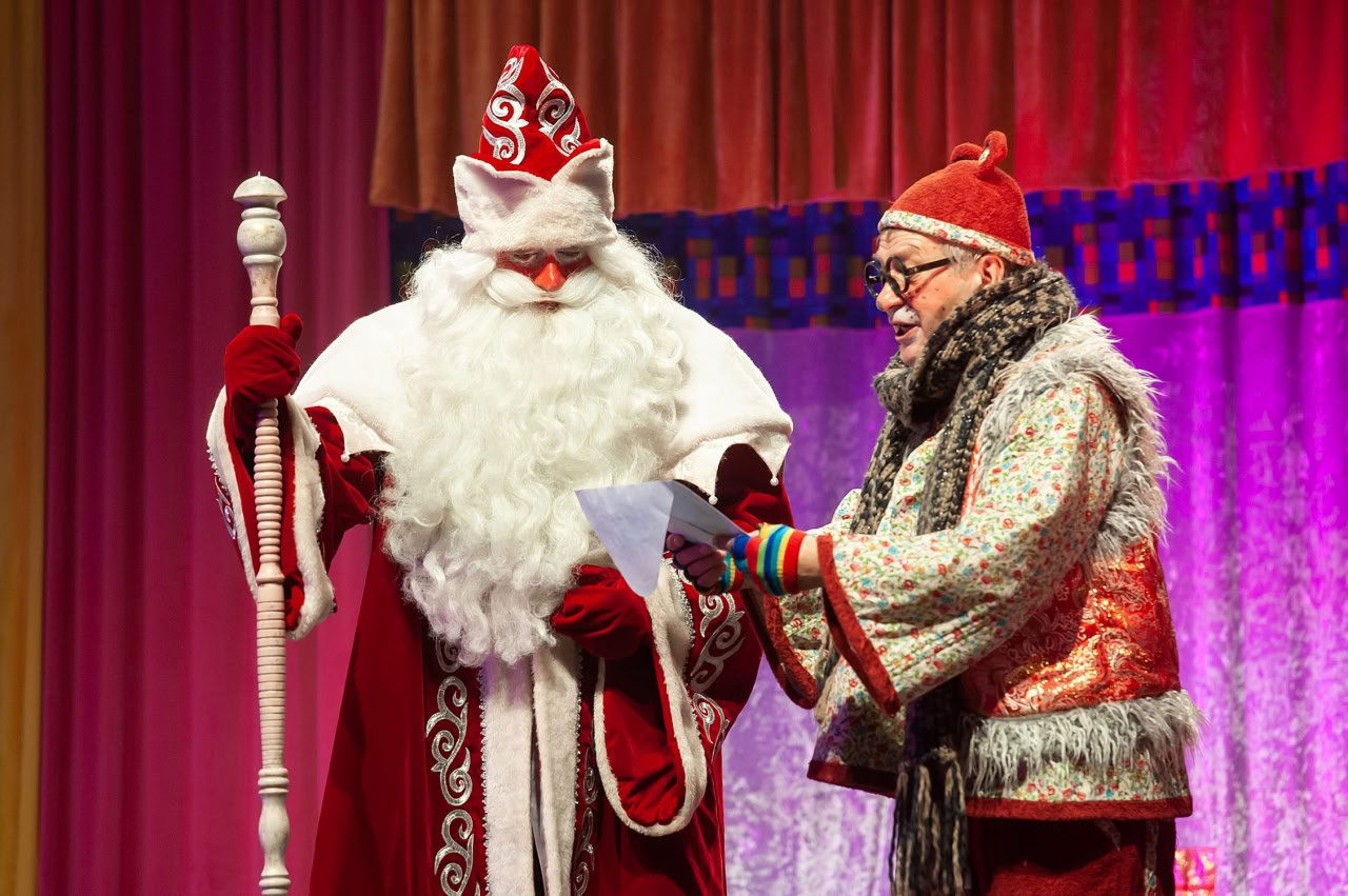 Дедушка не стал морозить Волчонка и Лисёнка, а открыл для них «Школу Деда Мороза». Стал учить зверят, как правильно Новый год встречать, как подарки друг другу дарить. И экзамен Дедушка Мороз устроил: путешествие к своему братцу, Северному Ветру, за волшебными нитками, чтобы сапоги починить. А потом своих учеников подарками одарил. И про ребят в зрительном зале Дедушка Мороз не забудет – выпускники дедушкиной школы вынесут большие мешки и выпустят из них, на радость мальчишкам и девчонкам, много-много воздушных шаров!