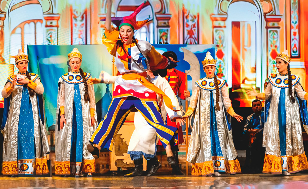 В исполнении артистов Государственного Волжского русского народного хора сказка предстает в новом, незнакомом ракурсе, благодаря уникальному сочетанию актерского мастерства исполнителей, живой энергии народных песен и танцевальных композиций, красочных костюмов и необычных декораций в стиле уличного театра.