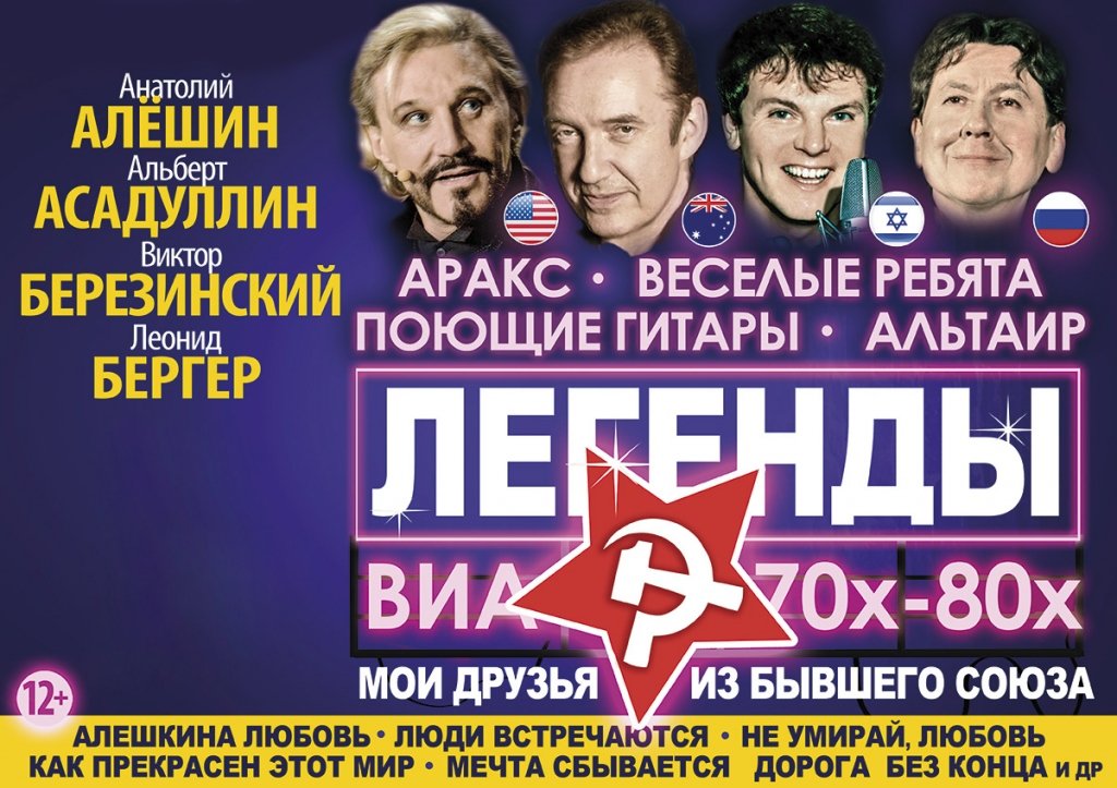 Легендарные солисты ВИА 70х-80х «ПОЮЩИЕ ГИТАРЫ», «ВЕСЕЛЫЕ РЕБЯТА», «АРАКС», «АЛЬТАИР» АЛЬБЕРТ АСАДУЛЛИН(РОССИЯ) АНАТОЛИЙ АЛЁШИН(США) ЛЕОНИД БЕРГЕР(АВСТРАЛИЯ) ВИКТОР БЕРЕЗИНСКИЙ(ИЗРАИЛЬ)