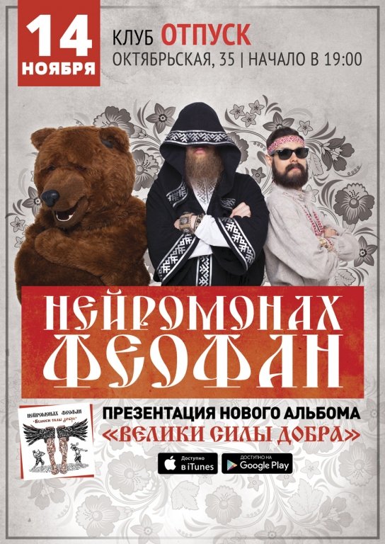 Нейромонах Феофан — искусник чудный, коими богата наша Русь-матушка. Душевный древнерусский drum'n'bass играет да любовь к земле родимой воспевает. Не приоткрывает завесу тайны — люд честной до сих пор не знает, что за умелец дивный под капюшоном скрывается. Да и зачем, коли музыка много важнее будет, интереснее, чем разговоры говорить-разговаривать. А уж зело ядрены пляски его лихие, да песнопения удалые! Как грянет удалой Драм, да под балалаечку, так ноженьки сами в пляс пускаются, ажно на месте стоять мочи нет! Вместе с Феофаном всегда рядом исключительный мастер дел музыкальных — Никодим да задорный косолапый медведь — уж больно негоже одному было бы свет да добро нести, дела благие совершать и супротив Асмодеев стоять. Нейромонах Феофан выпустил уже два сборника песнопений «В душе драм, в сердце светлая Русь» и «Велики силы добра», который и хочет разудало по городам и весям представит люду честному на концерте. Готовьте лапти покрепче и айда в пляс! Надо поле притоптать!